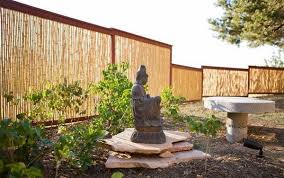Zen pillar garden design fence. It is considered to be the backbone of garden design as it adds beauty and aesthetic value to your home and landscape. The overall zen sensation of the space is enhanced by the presence of ancient stone lantern accent the bamboo fence and the garden shed designed in asian style. Photography by usha menard.